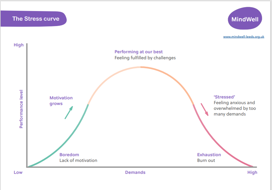 This Stress curve diagram shows how some stress can help us work at our best but also what happens when demands become too much.