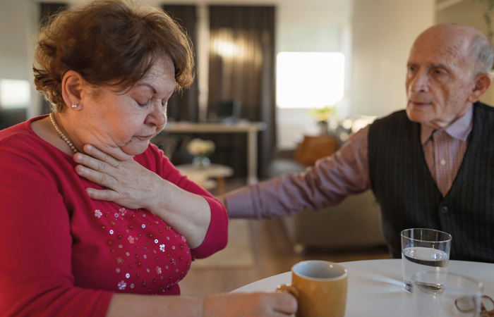 Signs of choking should always be taken seriously. When someone’s airway is partly or completely blocked, they may be unable to breathe properly, and this can be fatal. Signs of choking include difficulty breathing, speaking or coughing, a red puffy face and signs of distress – for example, someone may point to their throat or grasp their neck. If someone is unable to clear their throat by coughing themselves, someone nearby will need to step in to help them straight away. The methods of helping someone who is choking varies depending on their age. For adults, follow these steps: