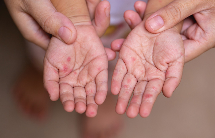Hand, foot and mouth disease is usually caused by a coxsackie virus and mostly affects children under the age of 10 years. It causes blisters on the hands, feet and in the mouth. It may sometimes cause more areas to blister or infect eczema. In most cases, it is a self-limiting infection though it may be painful and affect oral intake. Analgesia for children containing paracetamol plus antiseptic mouthwashes as needed can be taken. Viral skin swabs to tell apart hand, foot and mouth from the cold sore virus are needed if the rash is affecting a larger area or infecting eczema.