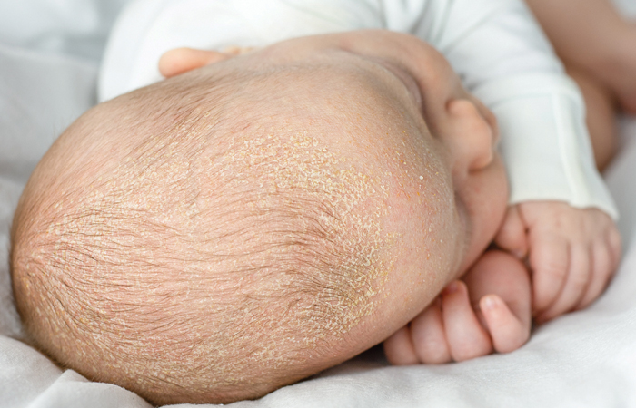 Seborrheic dermatitis (cradle cap) “is a common skin condition in infants and newborns that result from mild yeast overgrowth [which leaves] yellow or white scales on the scalp,” says Dr Latanya Benjamin, paediatric dermatologist. It usually goes away on its own, but parents can lightly massage an emollient onto the scalp to loosen the scales or gently brush the scalp with a soft brush before washing with baby shampoo. It is important that the scales are not picked, as this can lead to infection. Any sign of leaking or bleeding should be seen by a GP.
