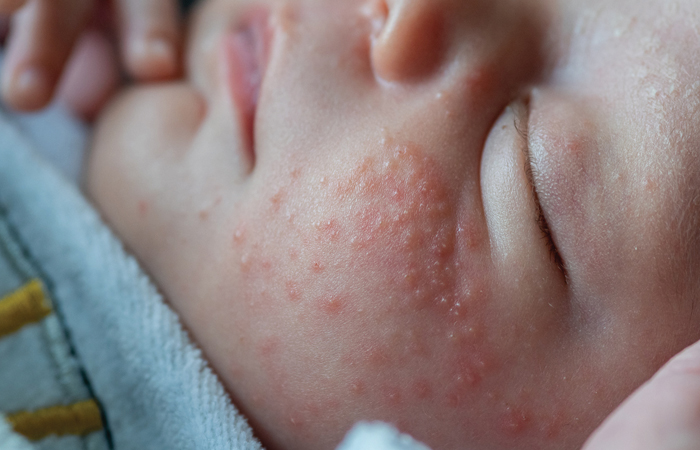 “Infantile eczema can develop from birth to six months,” says Dr Benjamin. “The cause results from a complex interaction between genetics, the epidermal barrier and its interplay with the immune system and environment.” In infants, eczema usually appears on the face, chin, forehead, cheeks and scalp, but it can also spread to other areas. On white skin, eczema presents as a red rash and as a white, purple rash on darker skin.