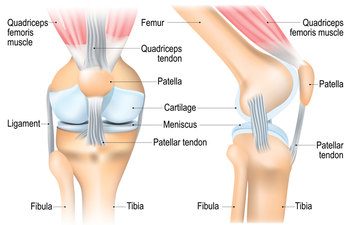 Joint movement is facilitated by cartilage, a smooth connective tissue that covers the ends of the bones. Some joints – those that allow the widest range of movement, such as the knees (as pictured) and wrists – also contain synovial fluid which provides extra lubrication and acts as a shock absorber.