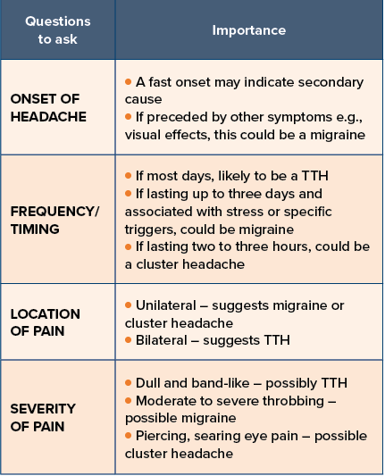 Most people will have experienced a headache at some time in their lives and self-managed the pain with analgesics. However, many patients will seek advice from community pharmacies, especially if the headache persists for more than a few days. A headache is a symptom, rather than a disease, with many different causes. Pharmacy staff therefore need to be aware of the key symptoms associated with the more common causes of headaches to decide whether it can be managed within the pharmacy or if onward referral is needed.