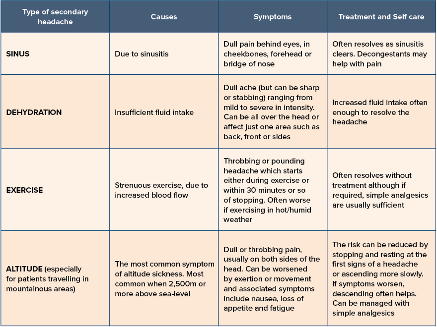 Although secondary headaches are much less common and are often a cause for concern, there are actually several types of secondary headaches which can be encountered in pharmacies that arise from an easily treatable cause, as shown in the table above.