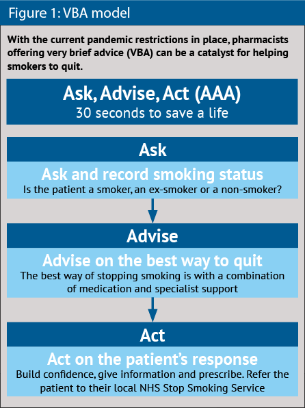 This may be one way of reviving pharmacy’s smoking cessation role but it is not enough to only treat sick patients referred from hospital who are tobacco dependent. Every contact needs to count and it has never been more important to offer very brief advice to smokers seeking to quit (see Figure 1).