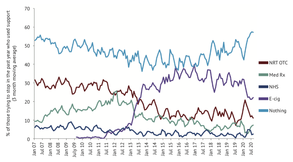 Since January 2020 there has been a clear upward trend in people trying to stop smoking with no support or no treatment (approximately 50 per cent). Unfortunately, this is the least effective way of stopping, with data showing only around 2-3 per cent of people will have been successful after one year.