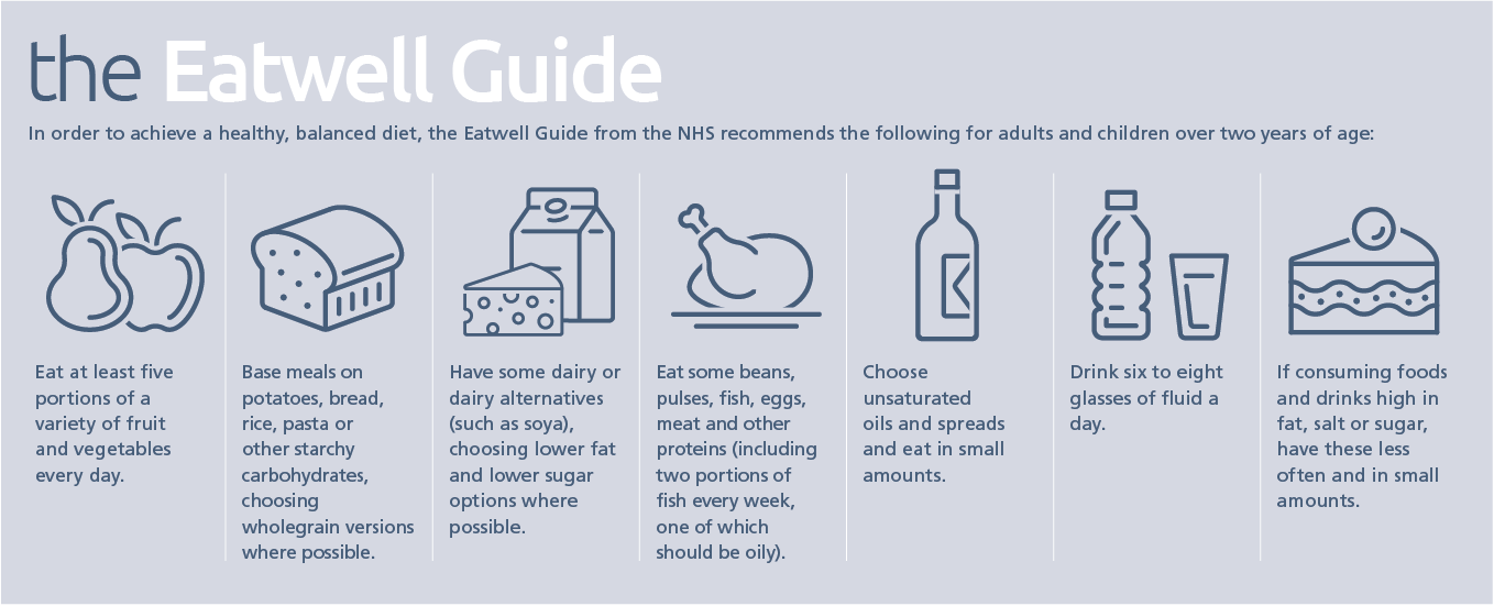 A balanced diet involves consuming the right types and amounts of food and drink to supply nutrition and energy to the body. This helps the body to maintain its functions and support normal growth and development. The NHS Eatwell guide shows the proportions of food groups that should be consumed to help to achieve a healthy balanced diet (see picture below).