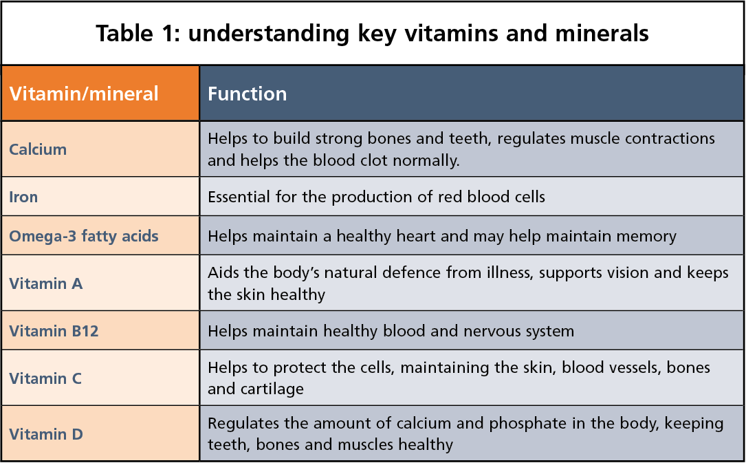 - Take an appropriate vitamin and mineral supplement, ideally containing 100 per cent of the nutrient reference value (NRV). An algae-based omega-3 supplement should be considered for those avoiding fish