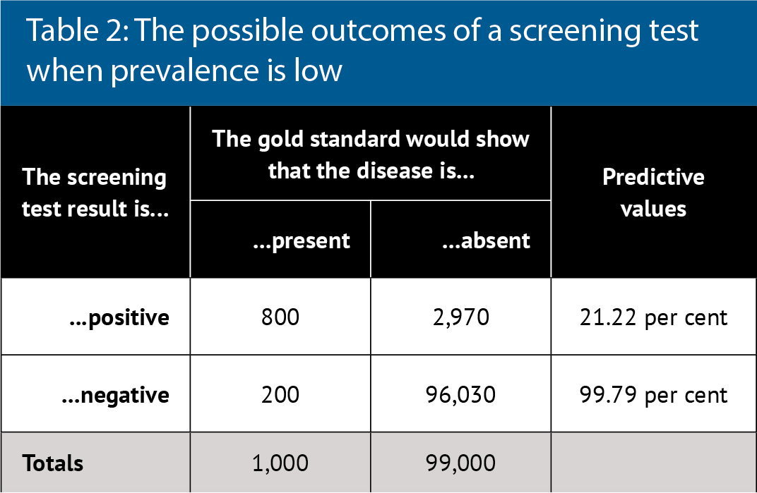 Table 2 considers a sample of 100,000 people when the disease (e.g. Covid-19) prevalence is 1 per cent and a screening test meets minimum WHO standards. Note that a negative test result is almost certainly correct in these circumstances, but many false positives would be generated. The PPV changes little with sensitivity but increases as prevalence increases.