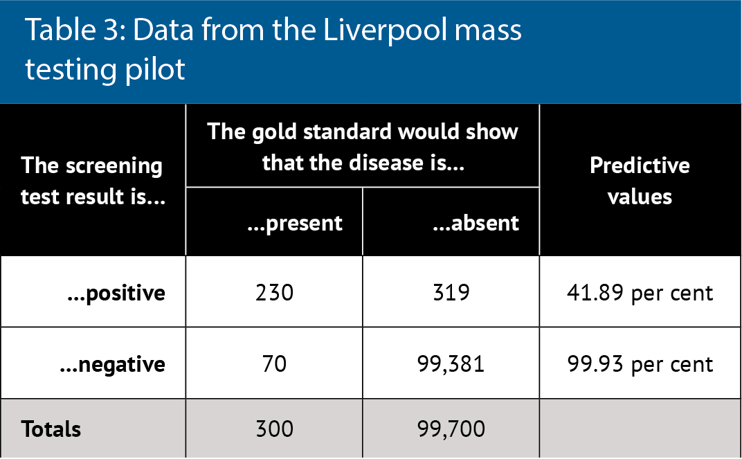 However, real world data and re-analysis of tests shows 76.8 per cent sensitivity and 99.68 per cent specificity. This data comes from the Liverpool mass testing pilot in which disease prevalence was 300 per 100,000 (0.3 per cent). PPV is 42 per cent overall but sensitivity also depended on who did the test: laboratory scientists were best (79 per cent) and self-testing was worse (58 per cent). Therefore, PPV actually ranged from 35 to 43 per cent. The greatest public health concern is not the inconvenience of a low PPV but rather the absolute number of false negatives, who can continue to spread disease.