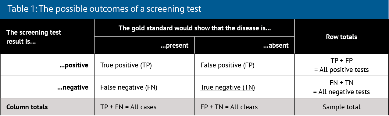 Screening tests are characterised by their sensitivity and specificity in comparison to a gold standard.2