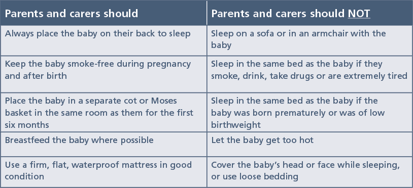 The Lullaby Trust has a huge range of resources for parents and carers, as well as healthcare professionals, to help encourage safer sleep at. The charity also has these quick tips: